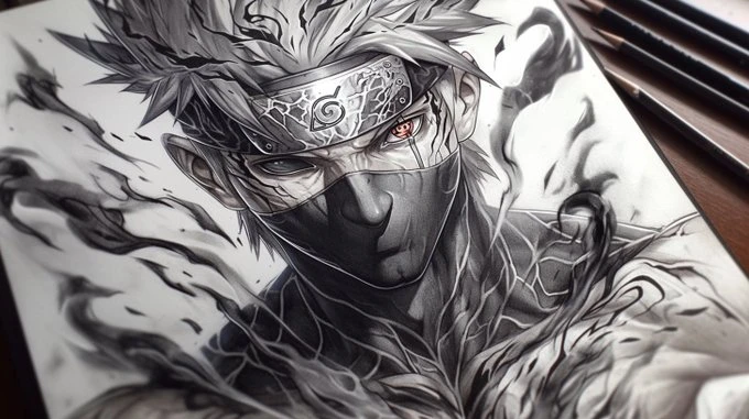 A pencil drawing of [Your character], with detailed lines and shading on white paper, capturing the energy and strength in his muscular body [with element effects] around the character, in a dynamic pose, tattoo design on paper, manga art style, dark background, high contrast, strong shadows, light and shadow effects, black ink drawing, dynamic pose