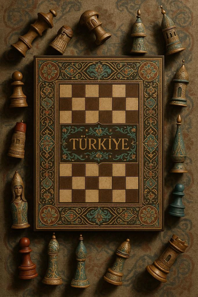 一张高度逼真的传统棋盘垂直照片,从上方看,背景是受 [COUNTRY] 艺术遗产启发的纹理表面。棋盘上有复杂的图案和国家图案,棋盘上用优雅的金色书法写着“[COUNTRY]”字样。所有的棋子都离开了棋盘,围绕着棋盘排列在织物上——有些侧躺着,有些直立着——仿佛等待着被放置。每件作品在形状、装饰和质地上都经过独特的重新构想,反映了 [COUNTRY] 的建筑、文化符号和调色板。丰富的素材、柔和的定向光、电影般的阴影、超详细的编辑静物风格、对称的自上而下的取景、9:16 格式。