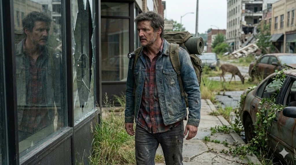 { “主题”: { “描述”:“一位身形粗犷的男性幸存者走过杂草丛生的城市街道”, "mirror_rules": "破损商店橱窗中的倒影", “年龄”: “40多岁” “表情”:“警惕地扫视着地平线,疲惫不堪” “头发”: { “颜色”:“盐和胡椒”, “风格”:“杂乱不堪的胡须” }, “衣服”: { “顶部”: { “类型”:“法兰绒衬衫和牛仔夹克”, “颜色”:“褪色的蓝红色格子图案”, “细节”:“肘部有破洞,被太阳晒褪色,有污渍” }, “底部”: { 类型:牛仔裤, “颜色”:“深灰色”, 细节:沾满泥巴的膝盖,磨损的下摆 } }, “脸”: { "preserve_original": true, “妆容”:“污渍、晒斑、逼真的风化效果” } }, “配件”: { "头饰": { "type": "无", “详情”: “不适用” }, “珠宝”: { “耳环”: “无”, “项链”: “无”, “手腕”: “坏掉的模拟手表” “戒指”: “戴在脖子上的链子上的结婚戒指” }, “设备”: { “类型”:“手电筒”, “细节”:“夹在背包带上” }, "prop": { "type": "登山背包", “细节”:“大号,橄榄绿色,附带睡袋,布料磨损” } }, “摄影”: { “camera_style”: “电影写实主义,35mm广角镜头” 角度: “广角镜头,展现环境”, "shot_type": "全身略微远离镜头走开", "aspect_ratio": "16:9", “质感”:“细致的树叶、明媚的阳光、自然的色彩” }, “背景”: { “场景”:“被自然重新占领的废弃城市街道”, "wall_color": "覆盖着常春藤的混凝土", “元素”:[ “生锈的汽车”, “高高的草丛撑破了路面”, 远处倒塌的建筑物 背景中可见鹿 ], “氛围”:“安静、荒凉、美丽的衰败”, “光线”:“阴天柔和的日光,漫射的阴影,忧郁的氛围” } }
