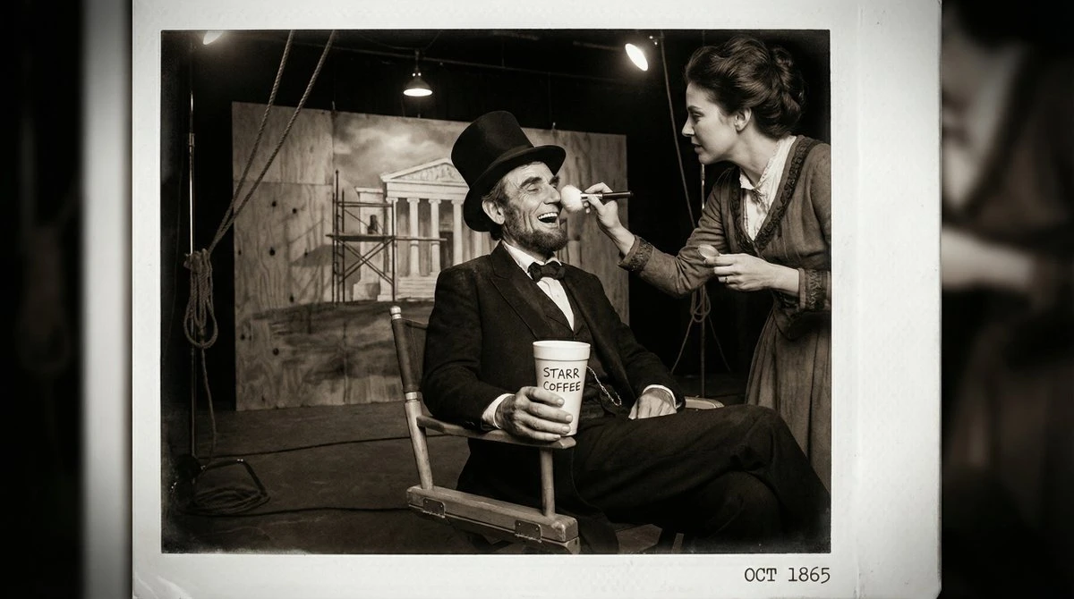 A candid backstage polaroid photo from 1865. Abraham Lincoln is sitting in a canvas director's chair, laughing hysterically while holding a styrofoam coffee cup. A makeup artist is powdering his nose. In the background, the Lincoln Memorial construction is just a painted plywood backdrop. Flash photography, vignetting, harsh shadows, breaking the illusion.