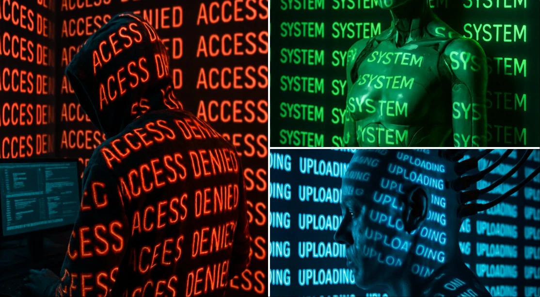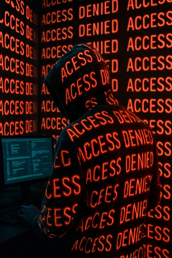 A [PERSON] in a dark room with a glowing projection of the word “[WORD]” repeated endlessly across the walls and body. The text is projected in high-contrast, neon [COLOR], wrapping around the contours of the object, creating a surreal, futuristic lighting effect. The background and object are seamlessly blended into the immersive text environment. Photorealistic, sharp shadows and light distortion where the text bends over curves. Studio lighting with deep contrast, moody cyberpunk aesthetic.
