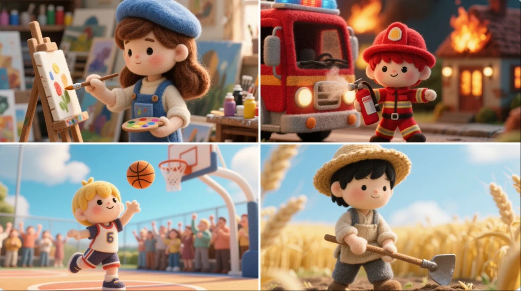 一个 [主题] 的毛毡羊毛人物,用柔软的纤维手工制作,缝线不均匀,纹理可见。该场景设置在分层织物和柔和道具的微型立体模型中,散发着舒适的故事书魅力,就像完全由毛毡和线制成的触觉定格动画童话中的剧照。