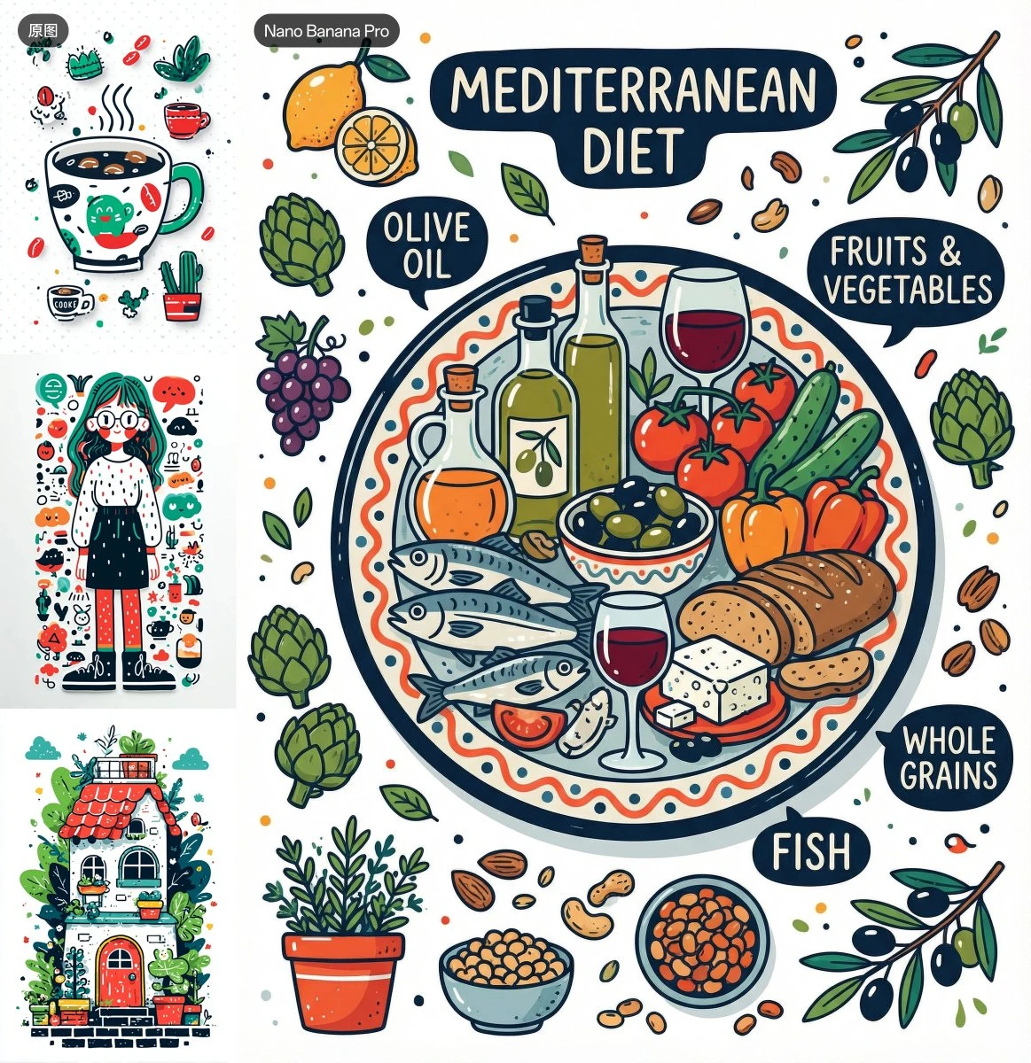 请帮我参考这三张图片的风格,绘制一张地中海饮食示意图