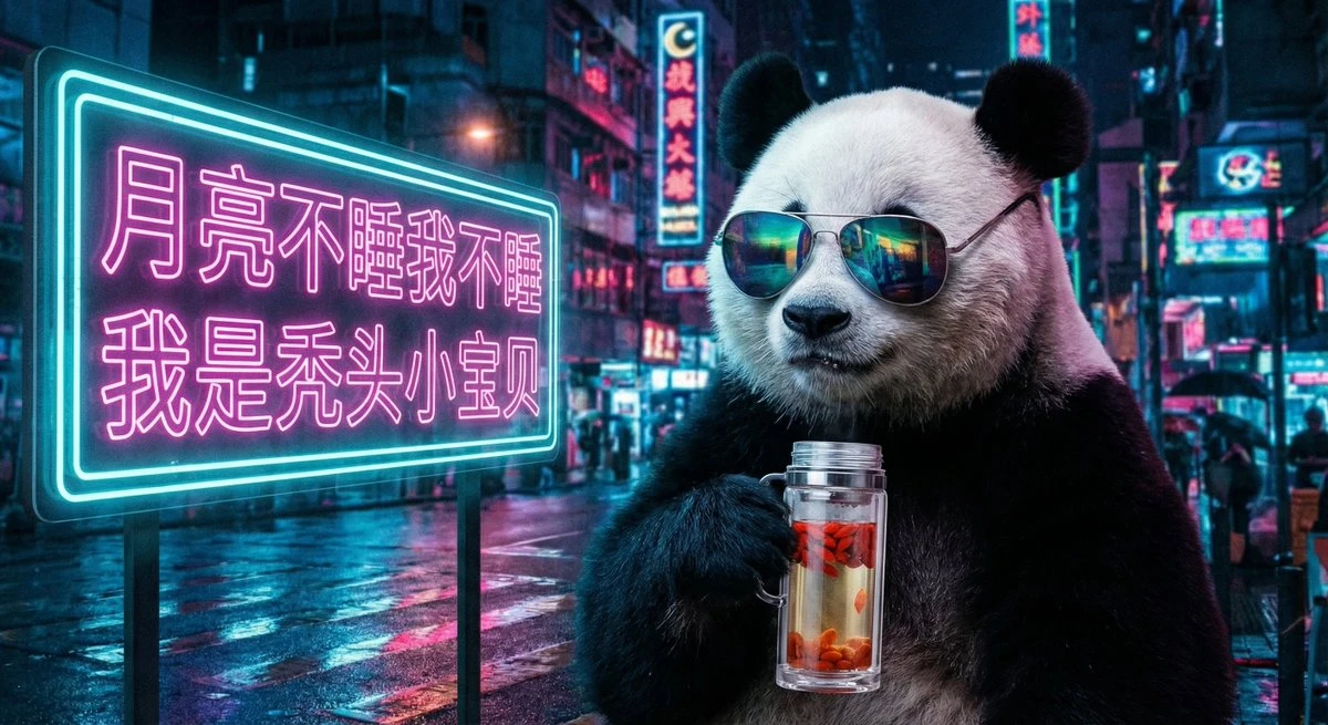 一只熊猫戴着墨镜,手里拿着保温杯(里面泡着枸杞)。背景是深夜的霓虹灯城市。熊猫身边的霓虹灯牌写着:“月亮不睡我不睡,我是秃头小宝贝”。