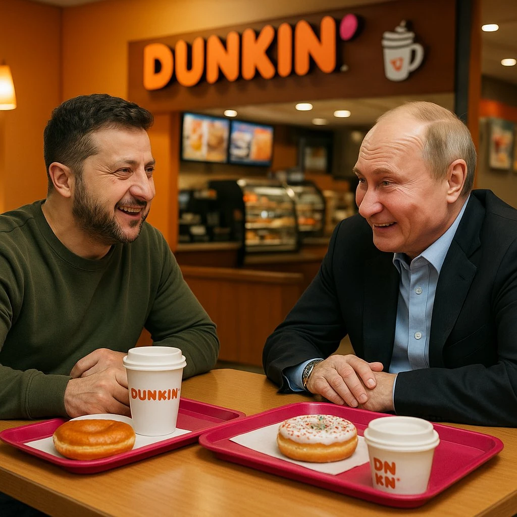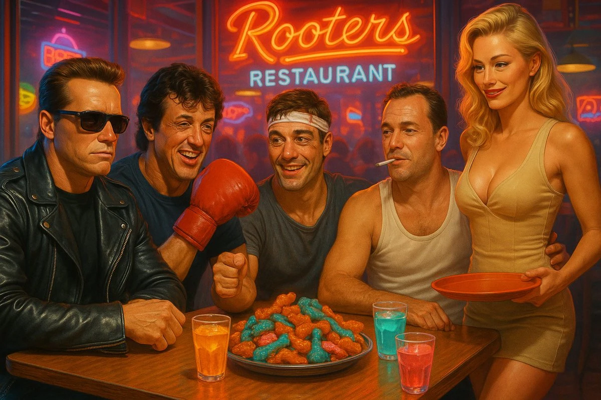 Imagine [CHARAKTER 1] and [Charakter 2] casually sitting together at a table in a [FAST FOOD BRAND] restaurant. The atmosphere is relaxed and light-hearted, with the two characters engaged in an amusing or deep conversation over trays of food and drinks.