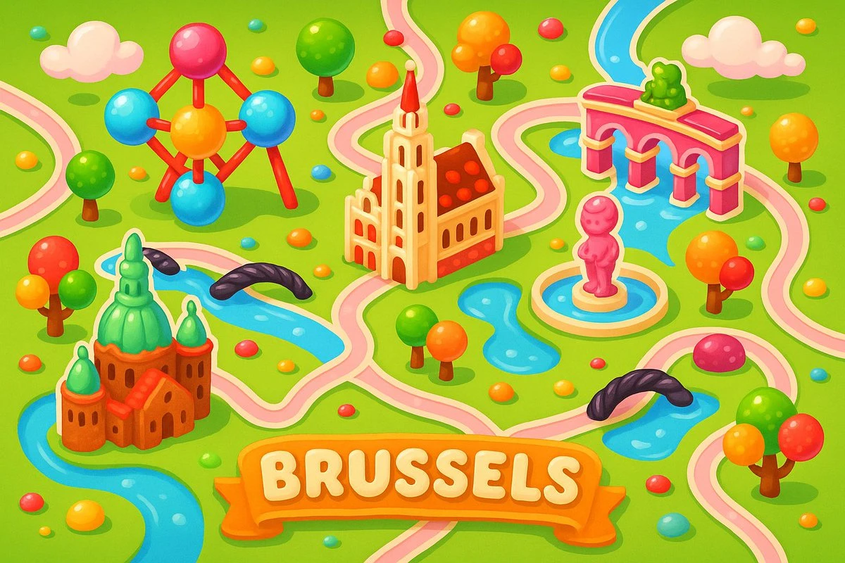 A colorful, playful 2D map of [city name], in the style of Candy Crush Saga, featuring the city’s iconic landmarks as candy-inspired buildings, cute gumdrop trees, licorice bridges, pastel roads, and glossy water elements, floating clouds, vibrant cartoon style, top-down view, kid-friendly game aesthetics, horizontal layout