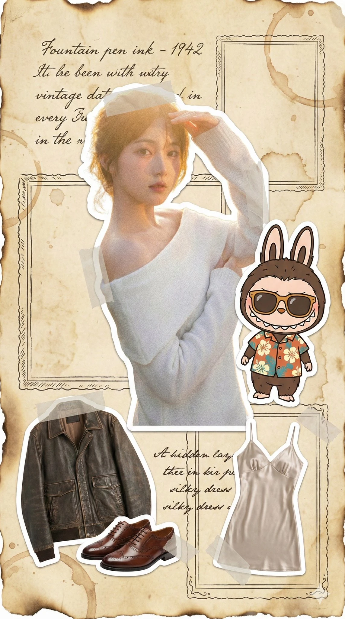 泛黄旧报纸手账 复古怀旧风格的9:16时尚插画。背景模仿陈旧的泛黄信纸,边缘有烧焦效果的手绘纹理和咖啡渍印记。中央是用户复古穿搭的贴纸,处理成胶片颗粒感,但保留白色贴纸边框。Labubu公仔贴纸戴着复古墨镜和花衬衫,坐在旁边。衣物解构部分展示了复古皮夹克和牛津鞋的贴纸。隐藏层贴纸是一件复古丝绸吊带裙,质感丝滑。周围用钢笔墨水风格绘制了优雅的草写英文日期和复古相框涂鸦。贴纸边缘用半透明的纸胶带图案固定。画面平整,无任何书写工具或手部入镜,纯粹的复古平面设计。